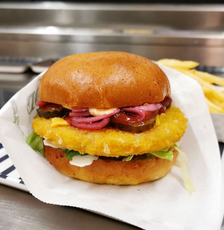 Bröd, enkel eller dubble krispig kyckling, dressing, picklad lök, mixsallad, saltgurka och tomat. Inklusive pommes.