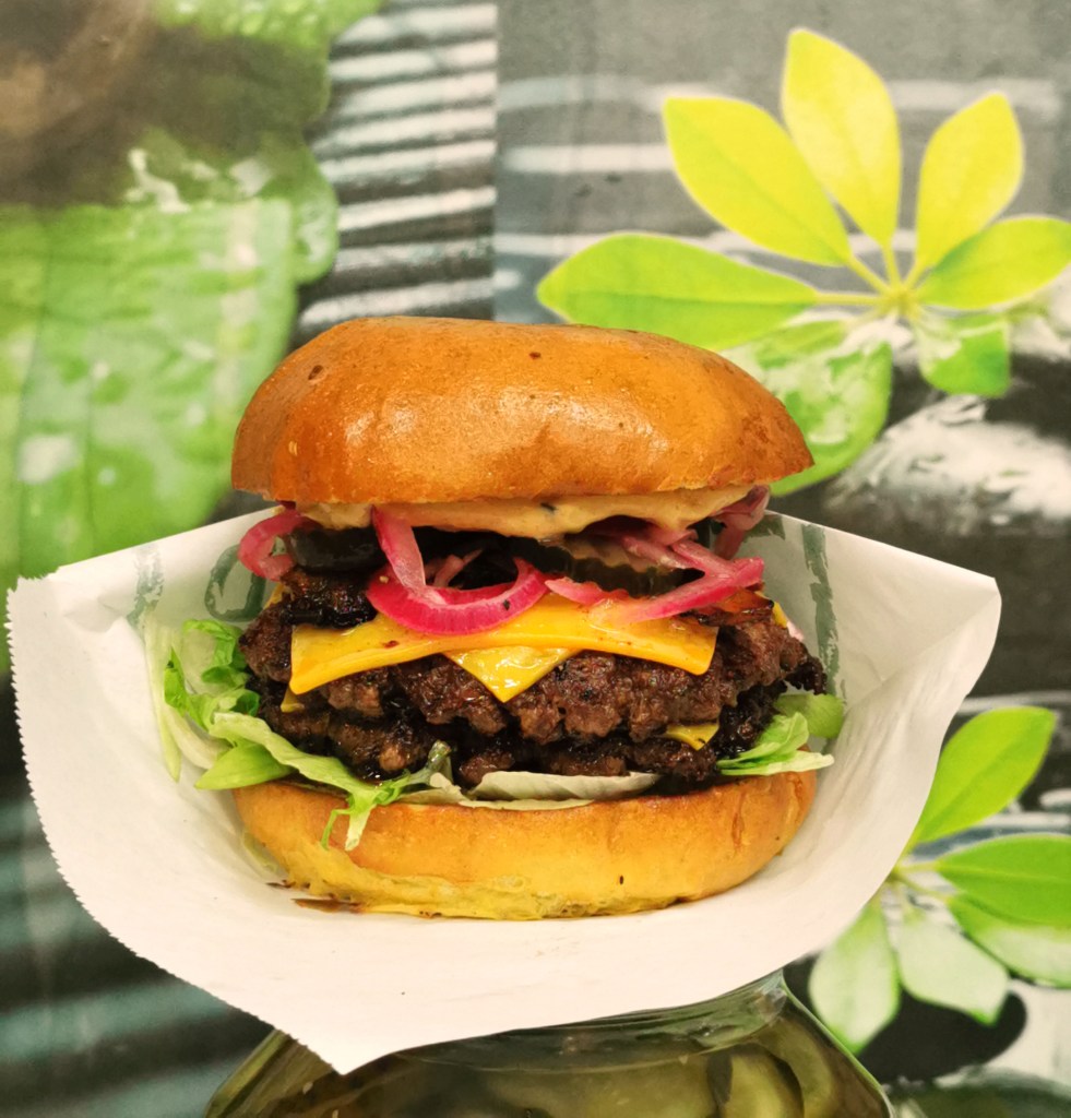 Högrevsfärs, bacon, briochebröd, cheddarost, dressing, Teriyaki sås, isbergssallad, champinjon, stek lök, salt gurka. Inklusive pommes.