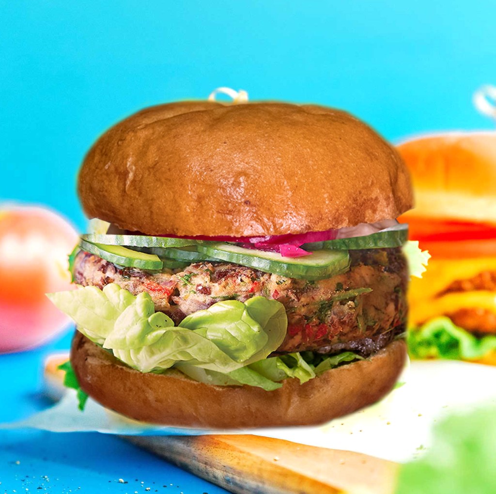Anamma Vegoburgare, briochebröd, veganost, Tryffelsås, lök, krispsallad och tomat. Inklusive pommes.